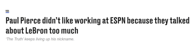 皮尔斯的这番话,从另一个角度来看也是为自己辩驳。当初在ESPN做节目时,皮尔斯常常谈论詹姆斯,包括詹姆斯的历史排名等话题,还被球迷喷蹭热度。现在据他自己表示,这只是节目的要求。从节目角度来看可以理解,毕竟,詹姆斯的人气摆在那儿,而作为昔日的对手,皮尔斯关于詹姆斯的言论总能引起热议。