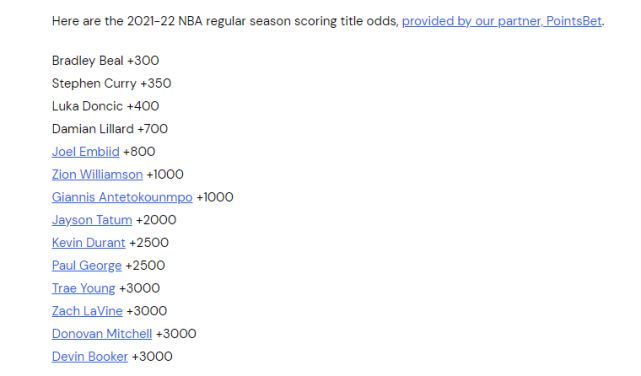 JRS直播网9月08日讯 ,2021-22赛季的得分王赔率排名出炉,奇才球星比尔位居第一,库里排名第二。杜兰特仅排名第九位,而在公布的前14名中,没有湖人球员上榜。