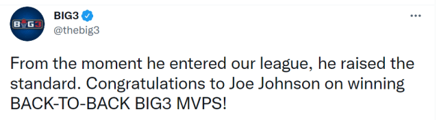 JRS直播网9月05日讯 ,BIG3联赛官方宣布,40岁的乔-约翰逊当选2021年的最有价值球员(MVP),这是他连续第二个赛季获得这一奖项。本赛季,乔-约翰逊以182分的总得分刷新了BIG联赛的得分纪录。