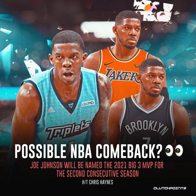 生涯至今,乔-约翰逊场均16分4篮板3.9助攻,7次入选全明星。17年NBA生涯,他累计赚到的薪水高达2.2亿美元。美媒clutchpoints晒出了他身穿篮网和湖人球衣的P图,提出问题:获得BIG联赛MVP的乔-约翰逊还有可能重返NBA赛场吗?