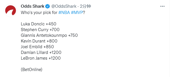 在这份赔率榜单上,库里、字母哥、杜兰特和詹姆斯都已拿过MVP。
