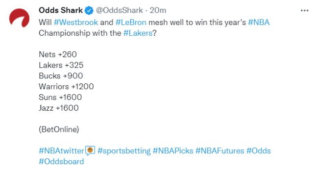 最新夺冠赔率前六位的依次是篮网(+260)、湖人(+325)、雄鹿(+900)、勇士(+1200)、太阳(+1600)、爵士(+1600)。在这次交易签约发生前,篮网的夺冠赔率是+300,因此,通过这些操作,他们的领跑优势更明显了。