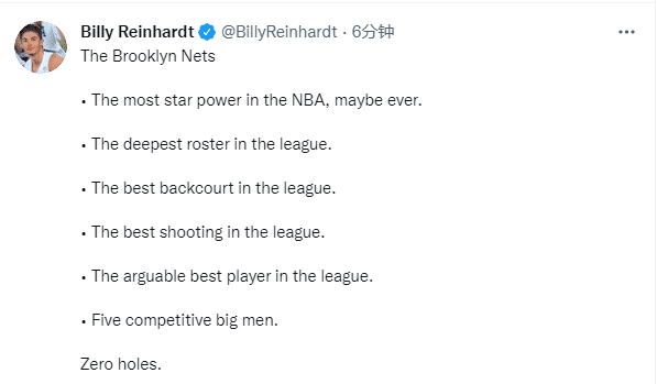 对于篮网新的冲冠豪阵,该记者发推:也许篮网是NBA 有史以来明星实力最强的球队,联盟中最深的阵容,联盟中最好的后场,联盟中最好的进攻, 有争议的联盟最佳球员,五个有竞争力的大个子球员,零漏洞。