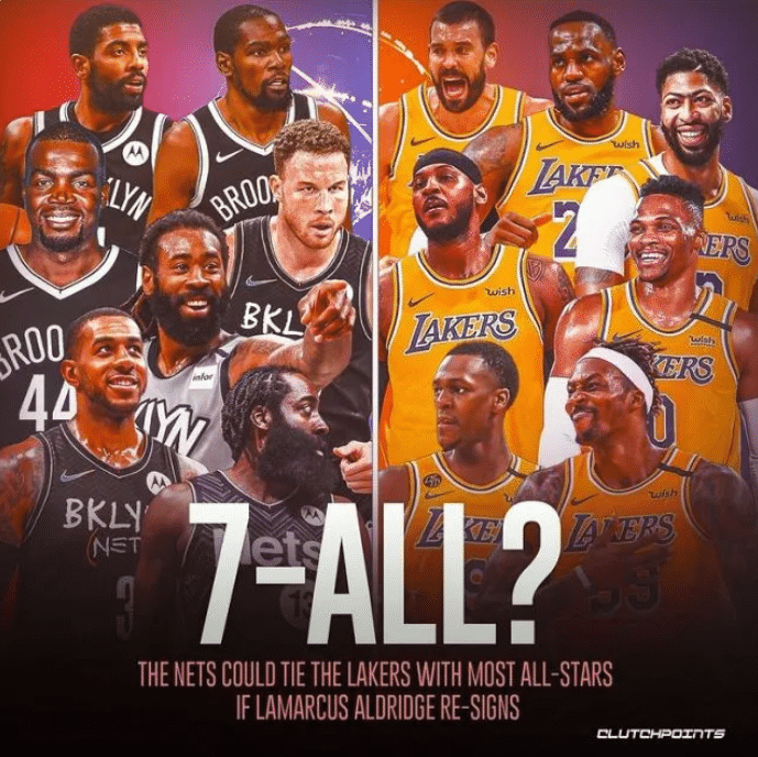 目前篮网已经打造了一支拥有6名全明星球员的豪阵——杜兰特、欧文、哈登、格里芬、阿德和米尔萨普,这6人都入选了2015年全明星阵容,合计44次进入全明星赛,篮网6位全明星仅次于湖人——7位全明星,东西部两大豪强都已打造冲冠豪阵。