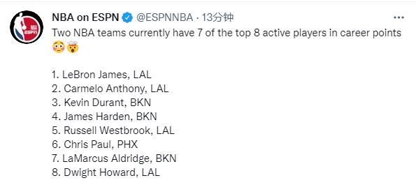 据美媒NBA on ESPN统计,在现役得分榜上,前八球员之中有7人为湖人和篮网效力。