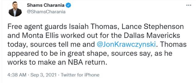 32岁的小托马斯一心想要回归NBA打球。此前,他在业余联赛上曾狂轰81分。现在小托马斯已经彻底恢复健康,渴望得到机会。上赛季他曾经和鹈鹕签下一份10天合同,但合同到期后没能续约。美媒报道称,湖人曾经非常接近签下小托马斯,但朗多和灰熊达成买断协议后,情况很快发生变化,湖人最终选择签回朗多。现在,小托马斯希望能通过试训打动独行侠,获得联手东契奇的机会。