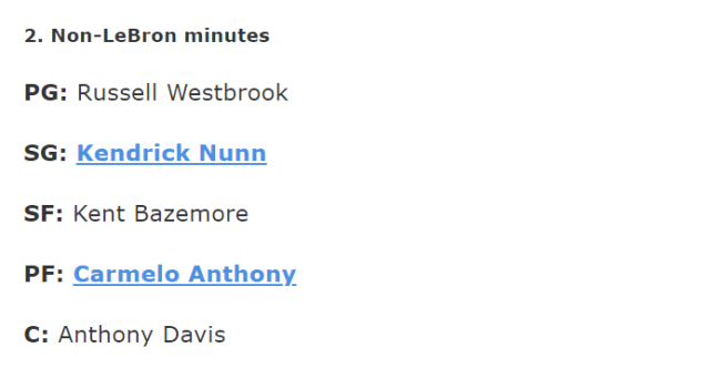 控卫:威斯布鲁克;分卫:纳恩;小前:贝兹莫尔;大前:安东尼;中锋:浓眉