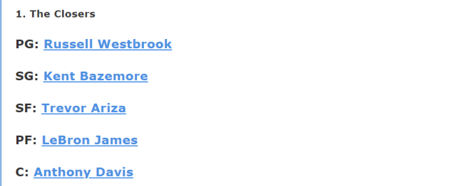 控卫:威斯布鲁克;分卫:贝兹莫尔;小前:阿里扎;大前:詹姆斯;中锋:浓眉