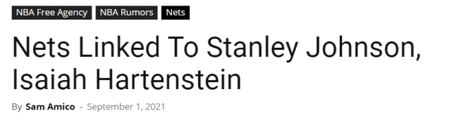 JRS直播网9月02日讯 ,据美媒最新报道,篮网的两大引援目标曝光。球队有兴趣和自由球员斯坦利-约翰逊签约,也有可能考虑哈登的火箭前队友哈尔滕斯坦恩。