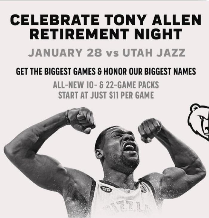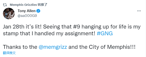 托尼-阿伦第一时间发推:1月29日亮了!看到9号球衣永远挂在球馆上空是我人生的最大荣誉,感谢灰熊队和孟菲斯这座城市。