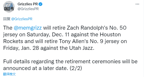 灰熊官方宣布,灰熊将在北京时间12月12日主场对阵火箭的比赛中,为功勋球员扎克-兰多夫举行50号球衣的退役仪式;而在明年1月29日灰熊主场对阵爵士的比赛中,将为另一位球队功勋球员托尼-阿伦举行9号球衣的退役仪式。