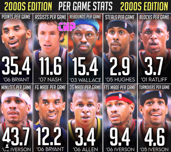 要想得分高,进球数肯定不能少,05-06赛季的科比场均命中12.2个球也是00年代单赛季之最。00年代那个时候的三分球,还并没有现在投得这么疯狂,作为三分命中数历史第一的神射手,雷阿伦在05-06赛季场均投进3.4记三分是00年代单赛季最高。艾弗森是造犯规的高手,职业生涯场均8.9次走上罚球线命中7个,05-06赛季场均命中9.4个罚球是00年代单赛季之最。另外,艾弗森失误也不少,生涯场均3.6次失误,04-05赛季场均则是达到4.6个创了00年代的尴尬纪录。