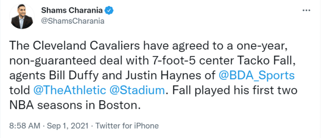 JRS直播网9月01日讯 ,据名记查拉尼亚报道,克里夫兰骑士已经和身高7英尺5英寸(2米26)的中锋塔科-法尔签下一份1年无保障的合同。法尔的经纪人达菲和海恩斯确认了这一消息。法尔前两个赛季效力于凯尔特人,如今,他将在骑士开启职业生涯的新篇章。