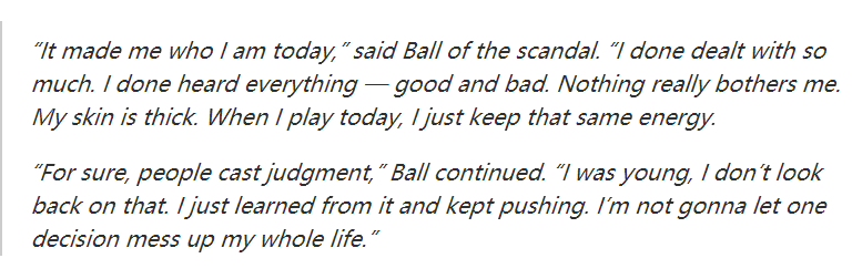 鲍尔表示:“这造就了今天的我,我要处理的事情太多了。我听到了所有的事情,好的坏的。但没有什么能真正困扰我。我脸皮很厚。当我今天打球的时候,我只是保持着同样的精力。当然,人们会做出判断,我那时还年轻,我不会回头看。我只是从中吸取教训,继续努力。我不会让一个决定毁了我的一生。”