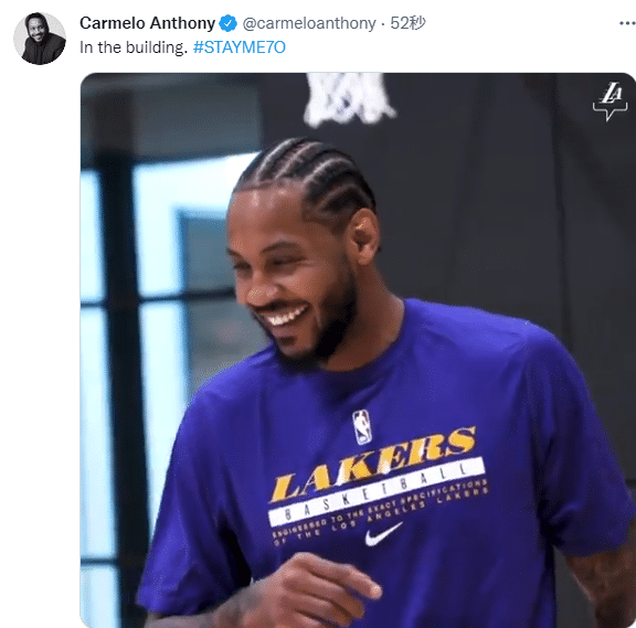 湖人队拥有4位13年全明星首发,其中只有安东尼还未尝到夺冠的滋味;不久前,37岁的安东尼首次身披湖人紫金训练服,现身湖人训练馆并且咧嘴大笑;安东尼本人转发训练视频,发推:在球馆中。