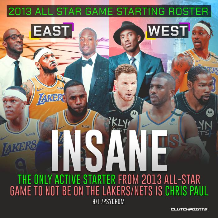 美媒Clutch Points晒照并配文:在2013年全明星首发之中,现役仅有保罗不在湖人或者篮网队。