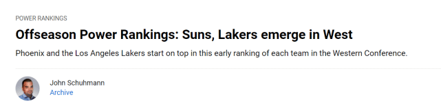 JRS直播网8月31日讯 ,NBA官方网站公布了休赛期西部各队引援后的实力榜。上赛季的西部冠军太阳队排名第一,组建三巨头的湖人位居第二。快船排名第五,勇士仅列第七。
