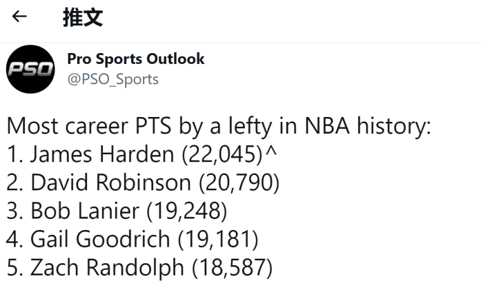 篮网巨星哈登目前已经砍下22045分,排在所有左手球员第一位。最为历史上最顶级的得分手之一,登哥此前曾连续三个赛季斩获得分王,其中18-19赛季的36.1分更是1987年乔丹之后单赛季最高。如果保持健康,大胡子未来有希望突破三万分大关,这应该也是哈登剩余生涯目标之一。