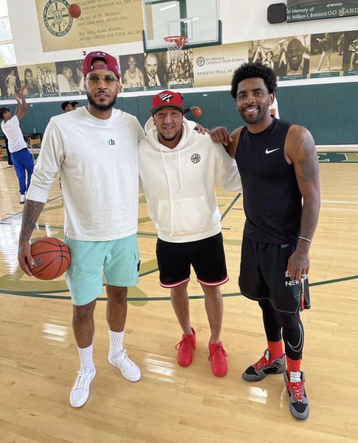 欧文和安东尼一起训练,欧文身穿布鲁克林篮网队的短裤,身穿黑色背心,安东尼则是一副大佬范,戴着眼镜并且反戴棒球帽,训练仍旧帅气出镜。