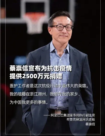 除了这些文化输出,真金白银上的支持也是必不可少。去年中国疫情最艰难时候,蔡老板宣布以蔡崇信公益基金会和篮网联合名义,捐赠高达2500万人民币。前段时间河南严重水灾,蔡老板又捐赠2000万人民币。