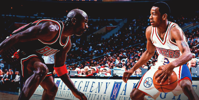 而谈论乔丹、科比詹姆斯三人,艾弗森表示“乔丹最好的一个赛季多少分?场均37分?我会说他(放到现在)能场均40分,而且是很轻松那种。是的,对乔丹来说场均40分是很容易得到的。当我谈到他时,一切都是不一样的。如果不是他,我不会成为今天的艾弗森。”