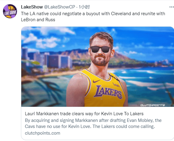 美媒以及无数球迷热议乐福被买断后将会加盟湖人,LakeShow晒出乐福身穿湖人球衣P照,发推:洛杉矶本地人可以在和骑士买断之后与詹姆斯、威少重聚;乐福曾在16年联手詹姆斯、欧文夺得骑士队史首冠,现在骑士有意买断乐福的合同,篮网有意捡漏抢人。