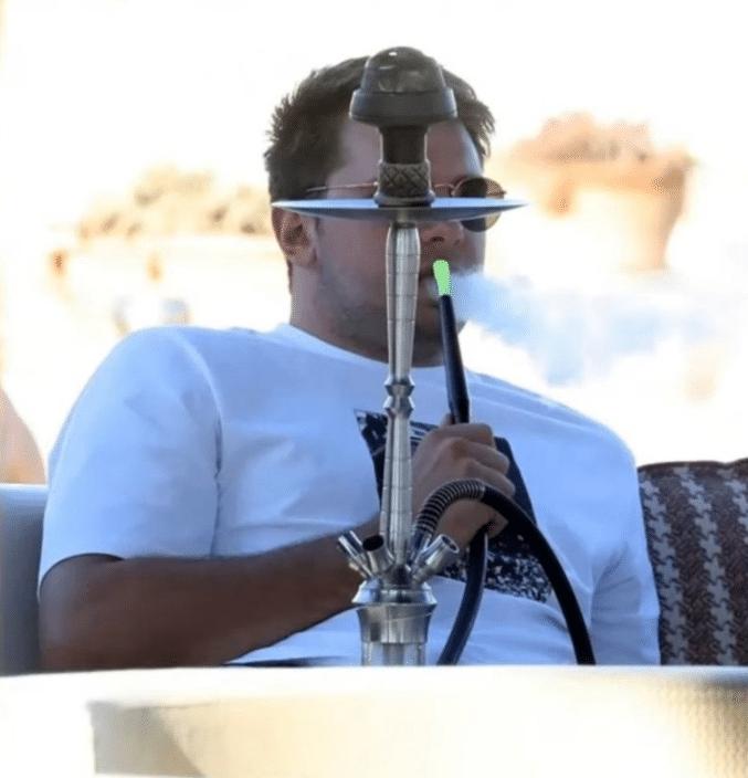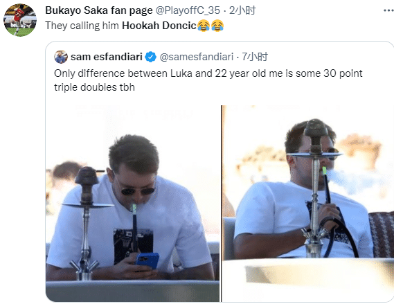 东契奇和女友一起度假,身穿白色T恤、戴着墨镜十分帅气,刷着手机抽水烟,吞云吐雾太有氛围;东契奇女友坐在他身旁,也带着一副墨镜。