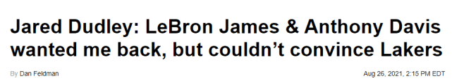 JRS直播网讯 北京时间8月27日,已经成为独行侠助教的杜德利接受《洛杉矶时报》的电话采访,自曝离开湖人的内幕。这位36岁的老将坦言自己仍想留队,詹姆斯和浓眉也希望他能留下,但他们未能说服管理层。杜德利坦言,自己认为佩林卡做错了。