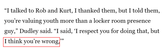 杜德利表示自己和佩林卡、兰比斯交流过,也感谢过他们,但并不认为他们的决定是对的。“相比更衣室的领导力,他们更看重年轻人,我尊重你的做法,但我认为你做错了。”
