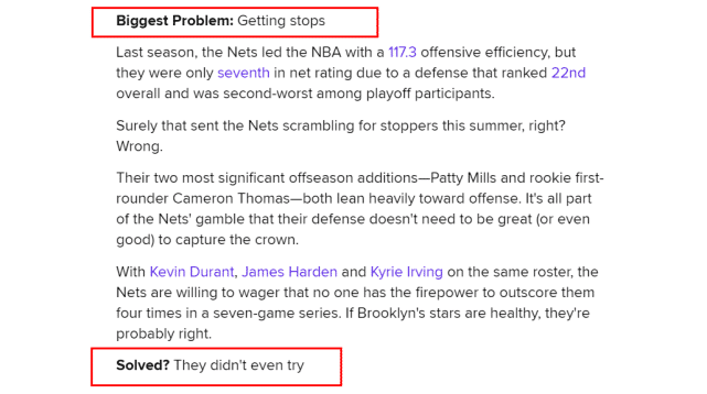 JRS直播网讯 北京时间8月27日,美媒Bleacher Report(B/R)解析30支球队上赛季的最大问题,并通过休赛期的运作,判定他们是否已经解决这些问题。B/R指出篮网的最大问题是防守,至于休赛期是否已经解决,美媒给出的答案很逗:“解决?他们甚至连试都没试(Solved? They didn't even try)。”