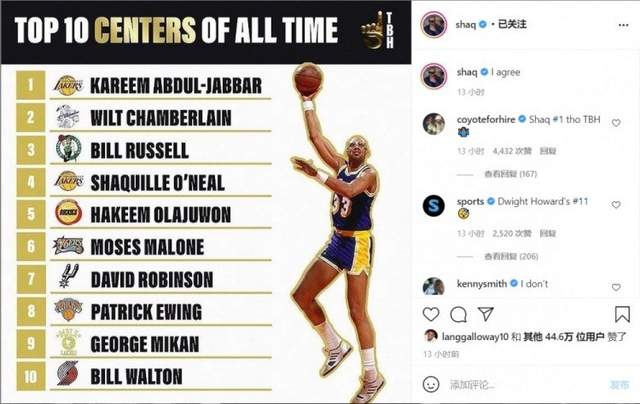 相比之下,奥尼尔反倒是大家最熟悉的中锋球员,因为他的搞怪性格加上他的霸气实力,他在全世界范围内都是吸粉无数。而奥尼尔之前一直将自己排在历史前三的中锋行列,这一次居然承认自己是第四名,这还是挺让人意外的。