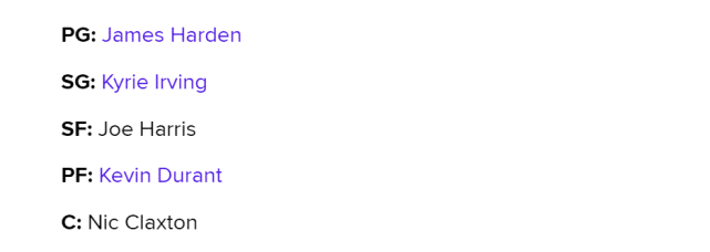 篮网首发:哈登+欧文+哈里斯+杜兰特+克拉克斯顿