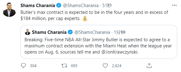 据名记shams报道,热火将在8月7日和巴特勒提前续签最大的合同,预计新签4年1.84亿美元的顶薪合同;目前巴特勒合同还剩下2年。