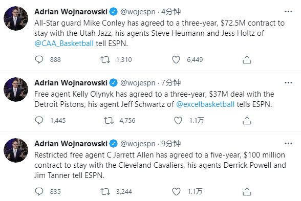 迈克-康利三年7250万美元续约爵士、自由球员奥利尼克3年3700万美元加盟活塞;前篮网球员艾伦和骑士达成5年1亿美元续约合同;伯克斯3年3000万美元续约尼克斯,诺埃尔3年3200万美元续约尼克斯,贾麦考-格林2年1700万美元续约掘金。