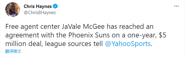 去年,麦基被湖人交易到骑士,之后又被骑士交易到掘金,季后赛为掘金出战替补出战4场比赛,场均仅打8.5分钟拿到2分3篮板和1.25盖帽,掘金在西部半决赛被太阳4-0横扫;如今,33岁的麦基接受1年500万美元合同,加盟太阳从而提升替补阵容的内线实力。