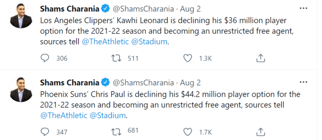 JRS直播网讯 北京时间8月2日,据名记查拉尼亚道,太阳球星保罗和快船球星莱昂纳德都计划拒绝执行下赛季的球员选项,他俩都将成为不受限制的自由球员。保罗下赛季的年薪是4420万美元,小卡下赛季的年薪是3600万美元,两人都有望重新签下一份多年合同。