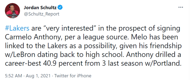 JRS直播网讯北京时间8月1日,据NBA记者乔丹-斯库兹报道,联盟消息源透露,湖人非常有兴趣签下安东尼。斯库兹表示,甜瓜和詹姆斯的友谊可以追溯到高中时期,而上赛季他在开拓者投出了生涯最佳的三分命中率40.9%。这正是湖人目前最需要的技能。