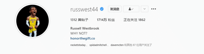 目前威少的IG粉丝数是1714万,他的新头像已经换成身穿湖人球衣的漫画照,再次公开宣布加盟湖人。