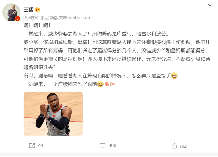 JRS直播网讯 北京时间7月30日,据名记报道,湖人和奇才关于威少的交易已经达成,威少新赛季将于詹姆斯并肩作战。