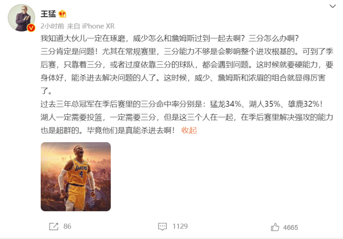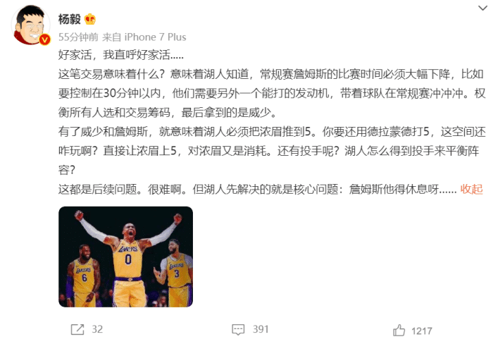 杨毅则直接喊出了“好家伙”而且看他分析,现在湖人是没打算留后路,先解决为詹姆斯解压的问题,至于找投手是后续问题!威少到来至少能让老詹安心休息,而且提出浓眉必须顶到5号位上,否则空间感太差了,但顶到5号位又怕他受伤,这可能是球队目前最纠结的问题!