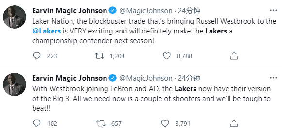 对于湖人引援威少,魔术师约翰逊发推:湖人国度,威少被交易到湖人的重磅交易令人兴奋,湖人肯定会成为新赛季总冠军的有力争夺者;现在湖人有了詹姆斯、浓眉和威少三巨头,我们现在还需要几个射手,我们很难被打败的。