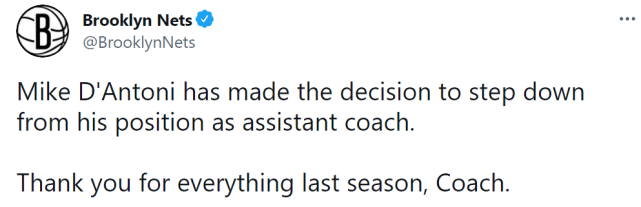 另外,篮网官方宣布,德安东尼已经决定不再担任球队的助理教练。据悉,德安东尼会寻找一份主教练的工作。纳什在官方声明里对德帅表示感谢:“我要感谢迈克(德安东尼)过去一年对我以及这支球队带来的所有帮助。在我担任主教练的第一年,能有他在身边是极其宝贵的,我会永远对他的指导心怀感恩,球员们也获益良多。我们祝福迈克一家未来一切都好。”