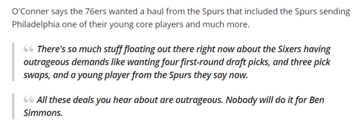 JRS直播网讯 北京时间7月29日,费城76人交易西蒙斯的要价曝光,据名记KevinO'Conner的报道,76人想在西蒙斯交易中得到4个首轮签+3个首轮签互换权+1名年轻球员,这是极其夸张、离谱的,没有球队会为了西蒙斯这样做;76人如此要价直接被马刺拒绝。