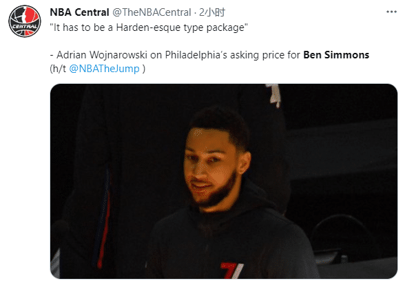 在西蒙斯交易中,76人向马刺索要年轻球员和一系列选秀权,名记沃纳罗斯基表示由于76人要价过高导致关于西蒙斯的交易至今未谈成,他们想要把西蒙斯当成哈登交易,对于这份报价,球迷调侃还以为交易的是恩比德呢。