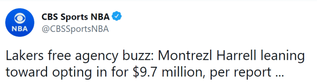哈雷尔在2019-20赛季当选联赛最佳第六人,但2020-21赛季过得并不开心。他离开快船,想要得到更多的出场时间,可是到了湖人,他的出场时间还不如快船。2020-21赛季,哈雷尔为湖人出战69场常规赛,场均只有22.9分钟, 而2019-20赛季效力快船,场均还有27.8分钟的上场时间。