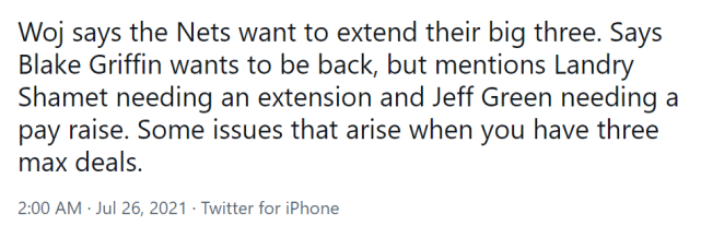 篮网三巨头的合同状况类似,2022-23赛季都是球员选项,换言之,2021-22赛季结束后,三巨头都可以跳出合同,同时成为自由球员。篮网为了得到三巨头,付出了大量的筹码,他们当然希望能够长留这三位巨星。休赛期提前和他们续约,成为篮网管理层的主要任务。