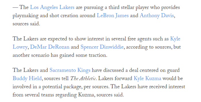 除了争抢洛瑞,湖人和国王已经讨论过希尔德交易,库兹马是交易筹码之一;目前库兹马是湖人在交易市场上的谈判筹码之一,湖人几乎向联盟中的所有球队都报价了库兹马和波普;现在有多支球队对库兹马很有兴趣。