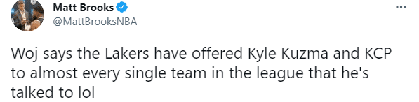 JRS直播网讯 北京时间7月26日,据名记shams报道,湖人已经公开交易库兹马和波普,他们不仅疯狂争抢洛瑞,而且已经和国王商讨关于希尔德的交易,还追求德罗赞、丁威迪等人;湖人锁定多个目标,积极交易库兹马、波普等球员,不得不说疯狂的休赛期来了。