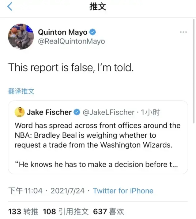 NBA记者Fischer报道,全联盟范围内的管理层人员收到消息,比尔正在考虑在北京时间周五的选秀大会前提出交易申请。
