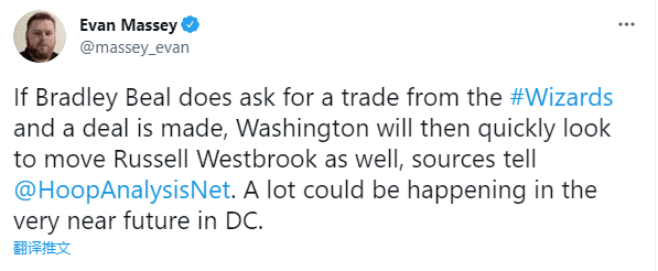 NBA记者EvanMassey报道,若布拉德利-比尔确实申请交易且交易完成,随后奇才将会很快寻求同样交易走威少。